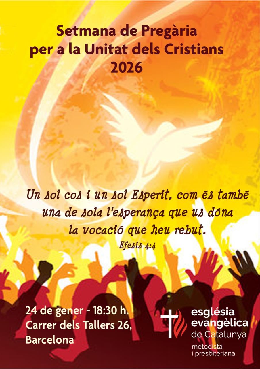 Com cada any, l’Església Evangèlica de Catalunya convoca a la celebració de la Setmana de Pregària per la Unitat dels Cristians. Ens unim per un sol motiu: gaudir de la pregària que ens uneix a tots, pregària pels que no tenen dret a la justícia, ni a la igualtat, ni tan sols a la dignitat.